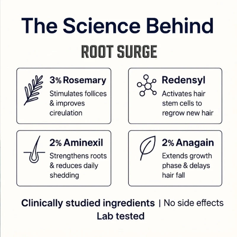 Root Surge uses a powerful blend including 3% Rosemary, 2% Redensyl, 2% Aminexil, and 2% Anagain. These clinically-backed ingredients work together to give you the fuller, thicker beard you've been craving, effectively and without fuss.